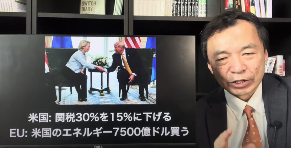 及川氏によると、EUはトランプ政権との関税交渉で「屈服」し、その内容は「屈辱的」であり、トランプ政権にとっては「完璧な勝利」であったという。具体的には、米国側関税が30%から10-15%に引き下げられる一方で、EU側には「米国のエネルギー(液化天然ガス、石油)を7500億ドル購入」する義務が課された。これにより、これまでロシアの安価なガスに依存していたドイツなどの競争力が失われる可能性があると指摘された。加えて、EUは「米国に6000億ドル投資」するという。これは日本の対米投資額(5500億ドル)を上回る額で、EU側は民間資金によるものと主張しているものの、実現可能性は不透明だ。